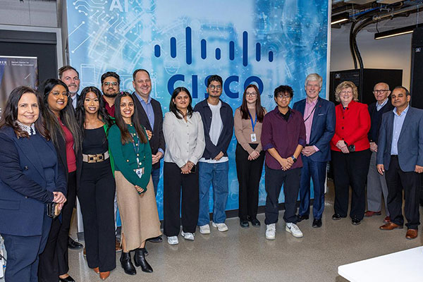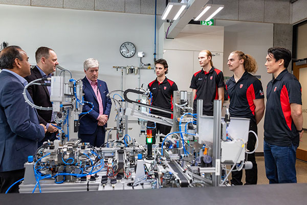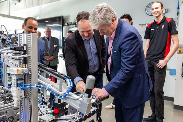 Humber executives were joined by Minister of Energy and Natural Resources Tim Hodgson and Secretary of State (Labour) John Zerucelli for a tour of Barrett CTI that included stops at the Magna Mechatronics Skills Training Room and the CISCO Digital Transformation Zone where they were introduced to Skills Competition training and the various research projects underway.